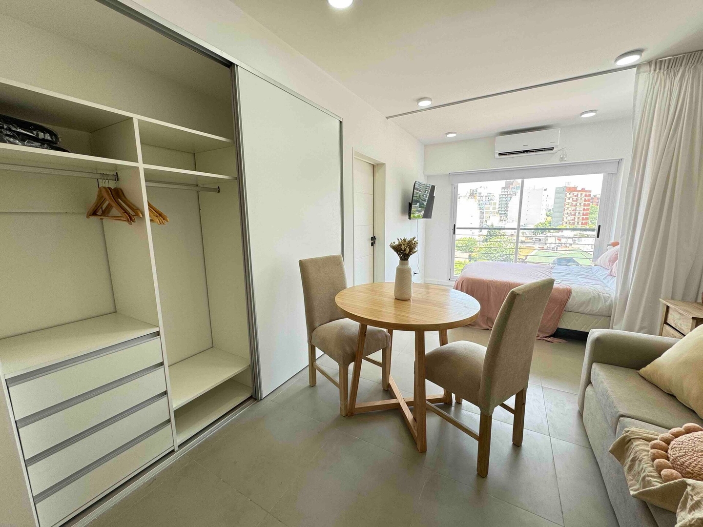 Departamento nuevo para 2 personas. Esta 100% equipado para estadias largas. Ubicado en el barrio de Parque Patricios. Cerca de varios hospitales como el Garrahan, y cerca del polo tecnologico. Esta sobre una avenida donde pasan colectivos que conectan con la ciudad.